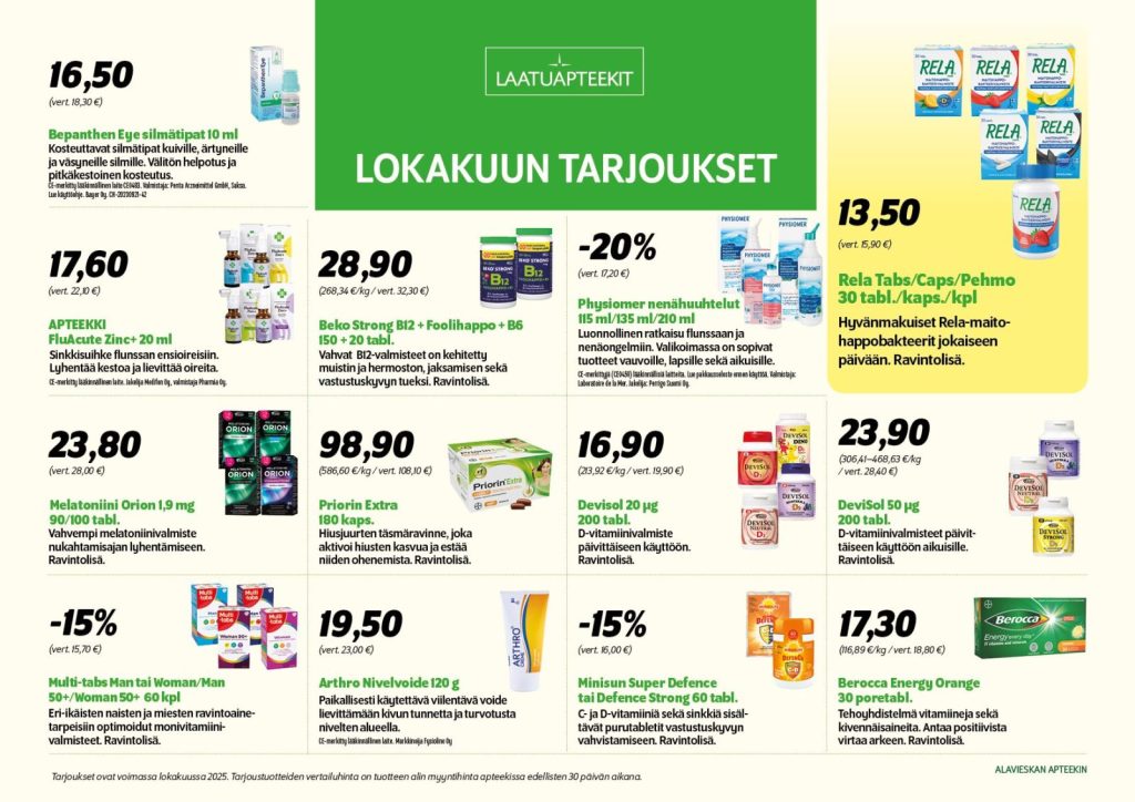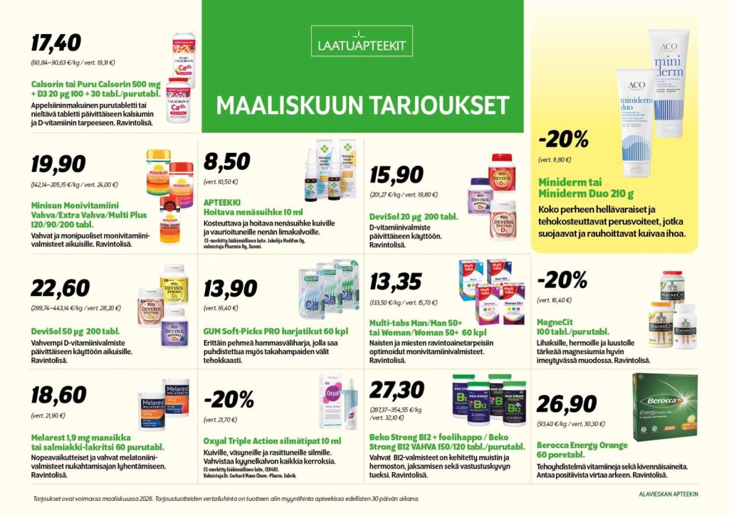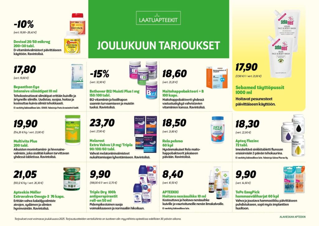 Alavieskan keskustassa sijaitseva asiantunteva apteekkimme tarjoaa kattavat lääkehuollon palvelut lähellä asiakkaitamme. Laatuapteekki ketjun osallisena jaamme alueen asukkaille ilmaiseksi Laatuapteekkilehden, joka sisältää ajankohtaisia tarjouksia sekä tärkeitä terveysvinkkejä ihmisille ja kotieläimille.